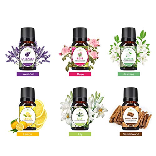 De etherische olieset bevat 6 afzonderlijke flesjes van 10 ml met zes geursoorten: lavendel, roos, citroen, lelie, jasmijn en sandelhout, die je een olfactorisch feest kunnen bezorgen.
